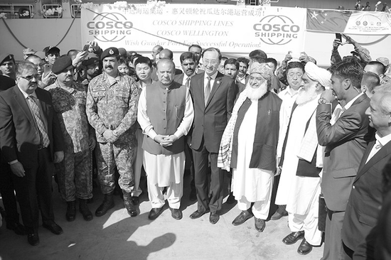 13日,巴基斯坦總理謝里夫等中巴官員在即將出海的中國貨船前合影留念。徐偉/攝