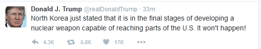 在第一條推特中,特朗普說:“朝鮮說,他們可以打到美國本土的洲際彈道導彈試射已進入收尾階段。這(攻擊美國本土)絕對不會發生!”