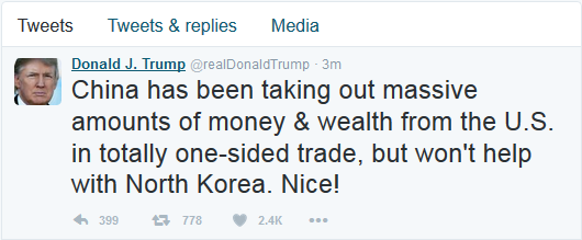 約40分鐘后,特朗普在第二條推特中又把矛頭對準中國:“中國通過完全一邊倒的貿易從美國賺取大量資金和財富,卻在朝鮮問題上不幫忙,真好!”
