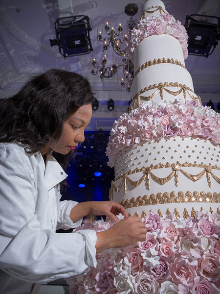 據(jù)悉,蛋糕設(shè)計師伊麗莎白·蘇拉瑞(Elizabeth Solaru)所使用的定制糖霜是用私人飛機從世界各地空運來的,耗費了1000多個鴨蛋。該蛋糕有香檳草莓、奶油蜜桃、西西里檸檬、紅絲絨和繽紛巧克力等5種口味。此款蛋糕原本有14層,代表婚禮在14日舉行。由于場地空間有限,蛋糕不得已被削減至10層,高達10英尺(約3米)。