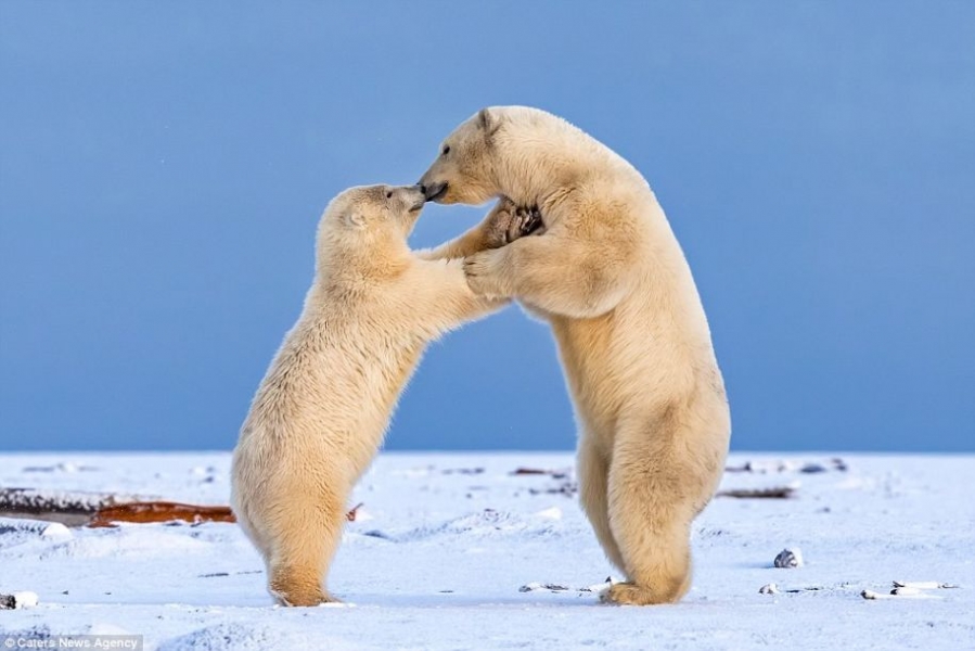 據英國《每日郵報》1月24日報道,近日,攝影師Shayne McGuire捕捉到了兩只小北極熊超有愛的一幕。這兩只小北極熊在等待母親捕食回來的時候,在雪地里手牽手仿佛跳起了華爾茲一樣,甚至還給了對方一個溫暖的吻。Shayne表示:“一般情況下是不會發生這樣的事情的。”