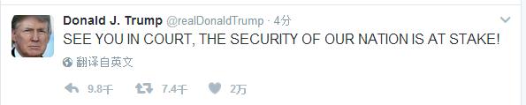 【環(huán)球網(wǎng)網(wǎng)快訊 記者 趙衍龍】美聯(lián)社2月9日消息,美國上訴法院宣布將維持對(duì)特朗普旅行禁令的暫停判決。特朗普隨后在推特上迅速作出回應(yīng):“法院見!我們國家的安全正處于危險(xiǎn)之中!”
