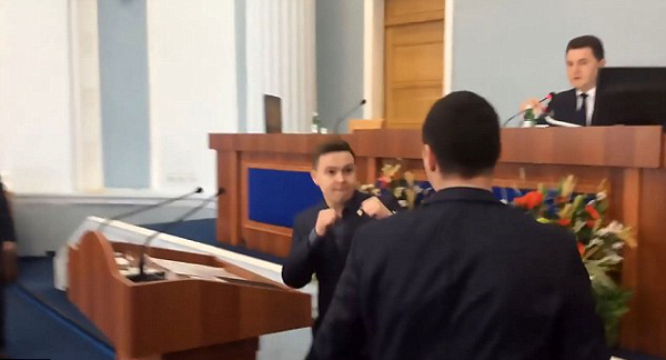 【環球網綜合報道】據英國《每日郵報》2月13日報道,近日,在烏克蘭切爾卡瑟地區議會上,自由黨領導人尤里(Yuri Botnar)因不滿客座嘉賓鮑里斯(Boris Lebedtsov)使用俄語作演講,不惜當場對其大打出手,場面一時頗為混亂。