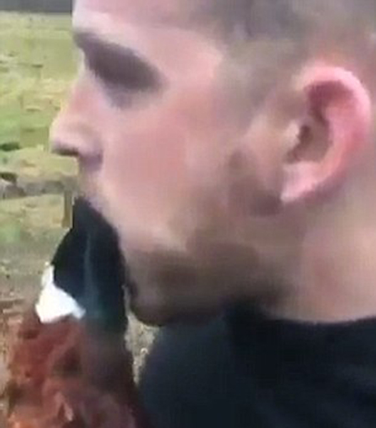 在面對鏡頭時,該男子還露出了一抹微笑。隨即,他將野雞頭從嘴里取出來,抓著野雞脖頸,假裝親吻野雞,令人不忍直視。