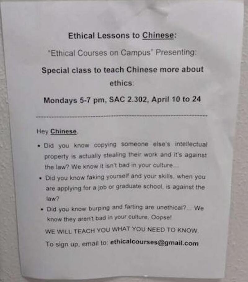 辱華布告的標(biāo)題為“給中國人上的道德課”,其中“中國人”一詞下面還加上了用于表示強調(diào)的下劃線。布告寫道:“中國人,你們知道復(fù)制別人的知識產(chǎn)權(quán)實際上是偷竊別人的成果并且是違法的嗎?我們知道在你們的文化這么做不是壞事……當(dāng)你們在找工作或申請研究生院的時候,你們知道在你們的信息和技能上作假是違法的嗎?” 此外,文中還指責(zé)中國人知不知道打嗝和放屁是“不道德的”,文中稱,“我們知道在你們的文化中這么做沒關(guān)系......哎喲!”