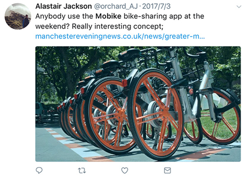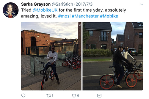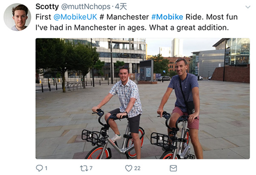 推特網(wǎng)友@muttNchops發(fā)文說道,“第一次在曼徹斯特騎摩拜,是這么多年來我在曼徹斯特玩得最開心的一次。(共享單車進駐)真是錦上添花。”