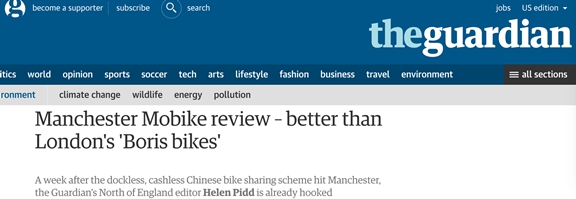英國《衛(wèi)報》編輯海倫·皮德也被中國共享單車“圈粉”,并撰寫了題為《評曼徹斯特摩拜單車——強于倫敦“鮑里斯單車”》的文章。她認為共享單車有隨停隨取、使用成本低廉、有騎行樂趣、鼓勵良好行為以及不耗費公共資金五大優(yōu)點,比已經(jīng)在倫敦運營數(shù)年的鮑里斯單車(由英國現(xiàn)任外交大臣,時任倫敦市長鮑里斯·約翰遜發(fā)起設立)要親民、便捷、好用得多。
