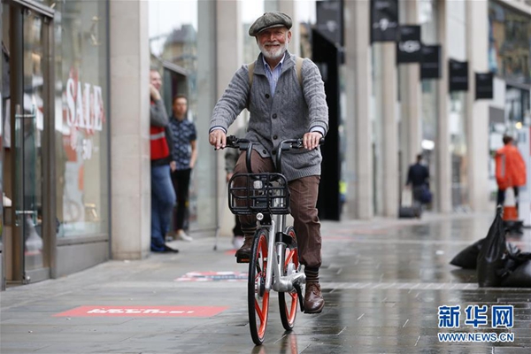 6月29日,在英國曼徹斯特,一名市民在體驗摩拜單車。新華社發(fā)(克雷格·布拉夫攝)