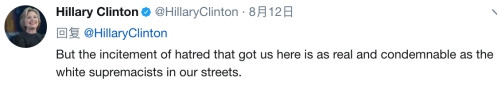 不只奧巴馬,美國前國務卿希拉里也發表推文說:“煽動種族仇恨的人應該和游行的白人至上主義者一樣受到懲罰。”