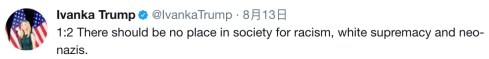 特朗普的女兒伊萬卡,對此事的態度也十分鮮明。她通過社交媒體言辭激烈地譴責“種族歧視、白人至上主義和新納粹”。她表示,這些思想在美國社會沒有存在空間。