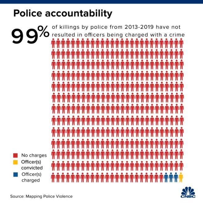 據(jù)美國媒體CNBC的統(tǒng)計,在2013到2019年間的總共7617起警察在執(zhí)法過程中致人死亡的事件中,在99%的事件中,警察都沒有遭到起訴。