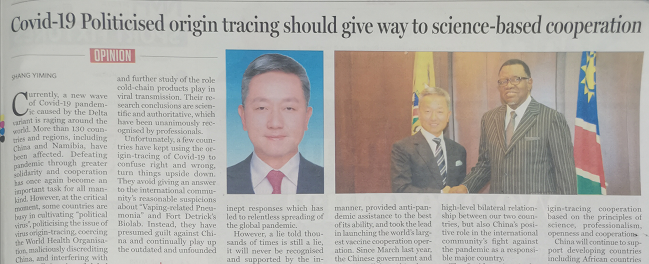 中國駐納米比亞大使在納主流媒體發(fā)文:病毒溯源不應(yīng)被政治化、污名化、工具化
