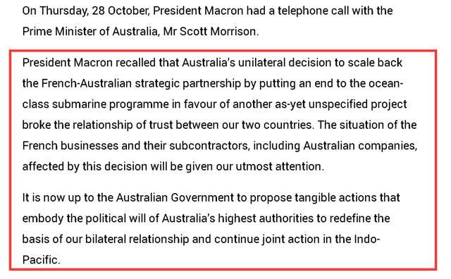 如下圖所示,在法國總統府發布的雙方通話聲明中,法方一上來就再次吐槽了澳大利亞之前在潛艇問題上背叛法國的舉動,稱這一行為損害了雙方的互信和雙方企業的利益,并稱澳方應該為重新建立起兩國在印太地區的合作和雙邊關系而拿出誠意。