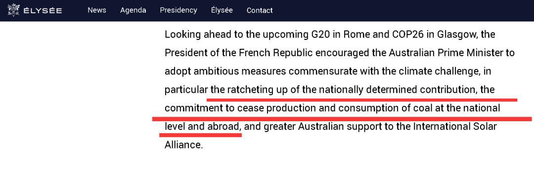 而在涉及氣候變化的部分,法方的說法也同樣讓莫里森頗為難堪,因為從措辭來看,法方似乎是覺得澳大利亞在應對氣候變化問題上不應該光有承諾,還應該付諸于行動,并尤其提到了澳方應該致力于減少煤炭的生產和使用。