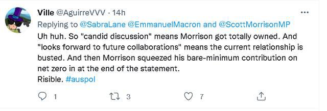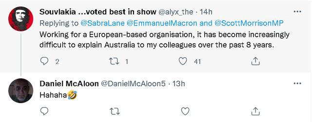 總之,當法方這份馬克龍在通話中對莫里森一陣數落和諷刺的聲明發布后,不少澳大利亞網民都覺得很尷尬。一些本身就很反感莫里森的網民還諷刺起了莫里森,稱他為了自己的政治利益歪曲通話內容,并認為法國對澳大利亞的抨擊很有道理。