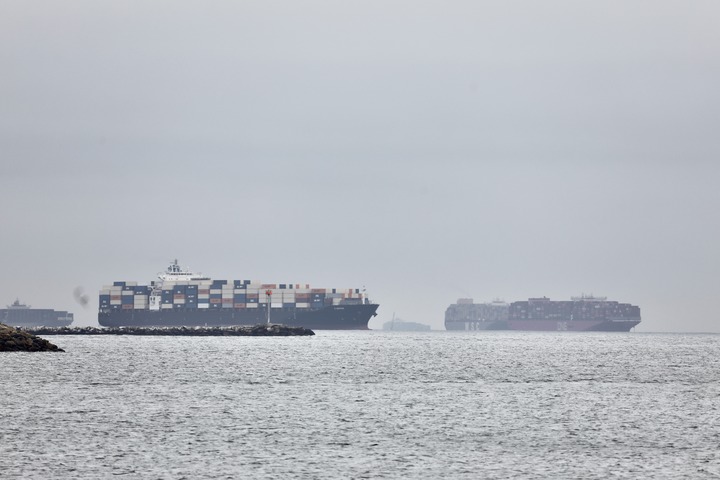 這是10月22日拍攝的在美國(guó)加利福尼亞州洛杉磯附近海域等待卸貨的集裝箱貨輪。新華社發(fā)