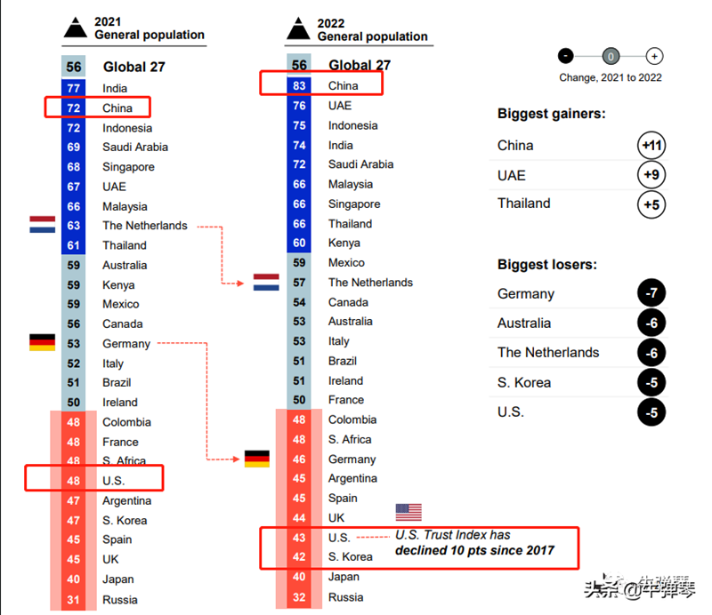 2021年是世界第二,但一年過去了,中國得分整整增加了11個百分點,是唯一一個信任度超過80%的國家。