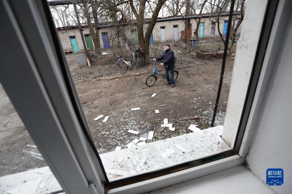 2月24日,頓涅茨克當(dāng)?shù)鼐用癫榭词軗p的房屋。新華社發(fā)