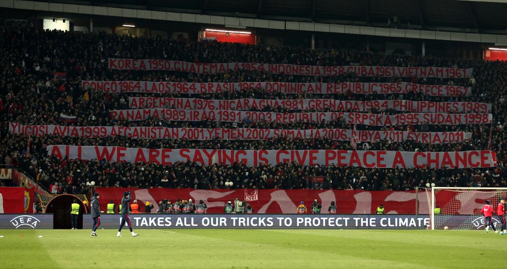 3月17日,在塞爾維亞首都貝爾格萊德舉行的一場足球比賽中,塞爾維亞觀眾拉起多條橫幅,細數(shù)美國、北約過去幾十年來轟炸或挑起戰(zhàn)爭的國家和地區(qū)名單,并高唱反戰(zhàn)歌曲,以此諷刺西方在“反戰(zhàn)”方面的雙重標(biāo)準(zhǔn)。(新華社發(fā),普雷德拉格·米洛薩夫列維奇攝)