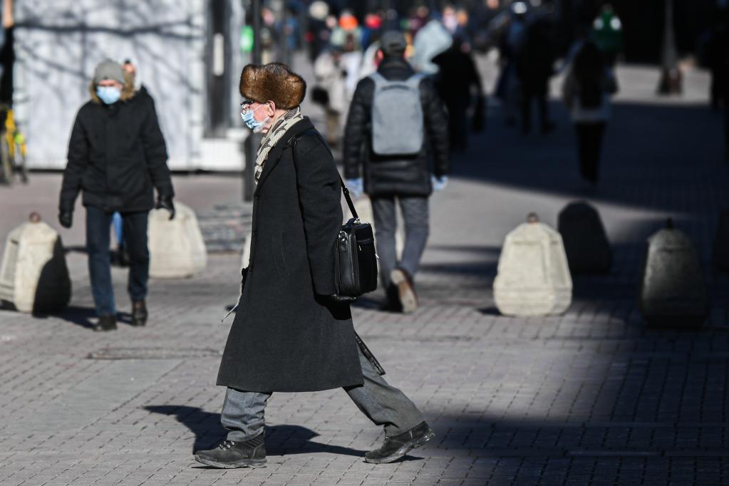 3月15日,人們佩戴口罩在俄羅斯首都莫斯科出行。(新華社發,葉甫蓋尼·西尼岑攝)