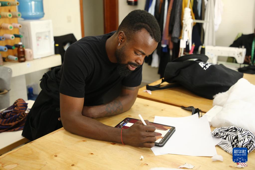 4月1日,在盧旺達首都基加利,Moshions品牌創始人摩西·圖拉希爾瓦在服裝品牌店的工作室內繪制服裝草圖。新華社發(黃萬晴攝)
