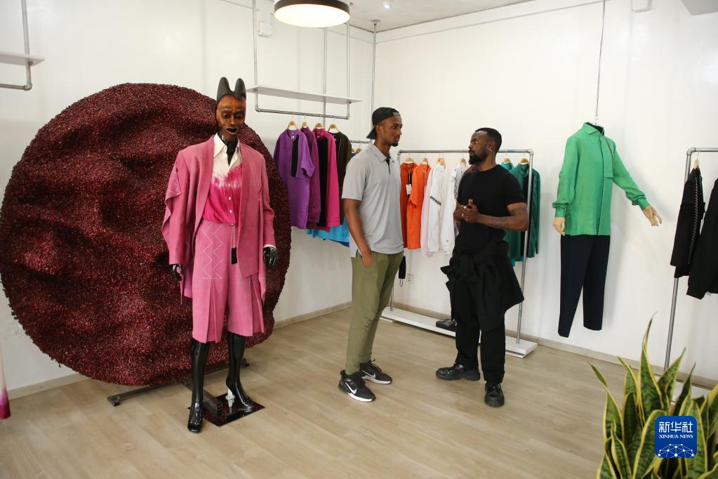 4月1日,在盧旺達首都基加利,Moshions品牌創始人摩西·圖拉希爾瓦(右)在服裝品牌店內與一位顧客交談。新華社發(黃萬晴攝)