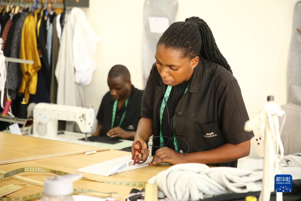 4月1日,在盧旺達首都基加利,工作人員在Moshions服裝品牌店的工作室內制衣。新華社發(黃萬晴攝)