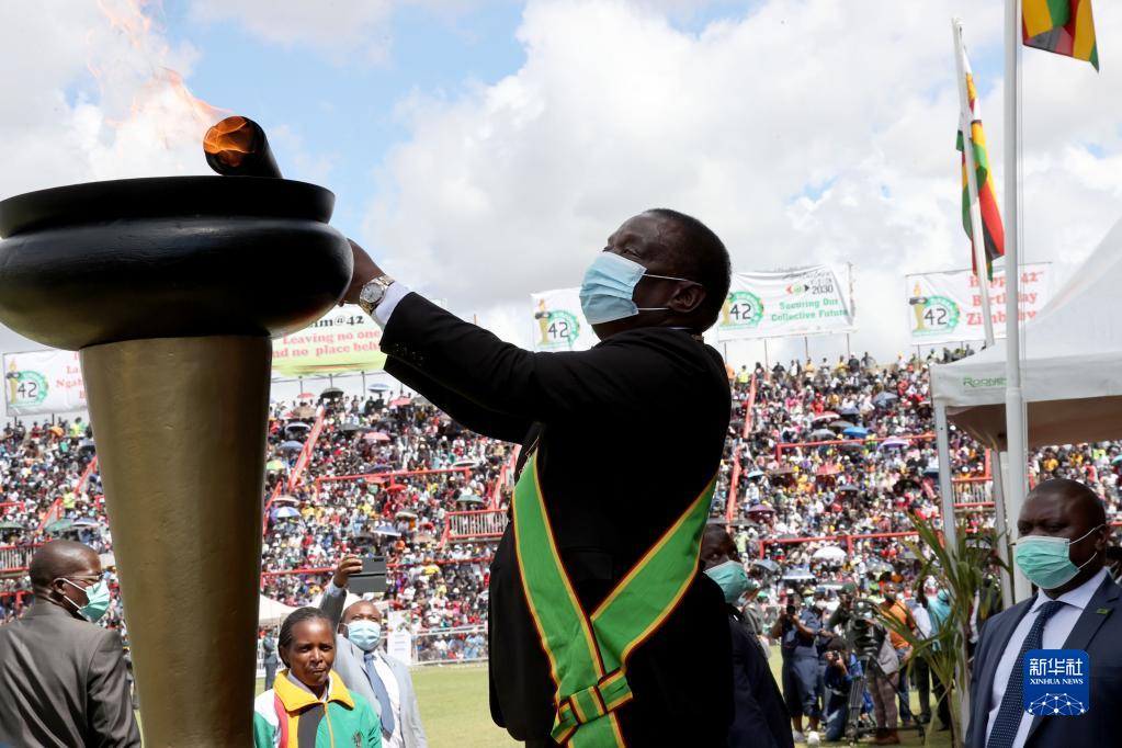 4月18日,在津巴布韋第二大城市布拉瓦約,津總統姆南加古瓦(中)在獨立42周年慶典上點燃象征獨立的火炬臺。新華社發(萬達攝)