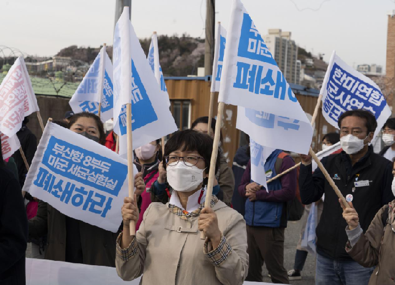 2022年4月5日,韓國民間團體在韓國釜山的美軍基地附近游行示威,呼吁停止韓美聯合軍事演習,要求關閉釜山港美軍基地內的生物實驗設施。李相浩攝