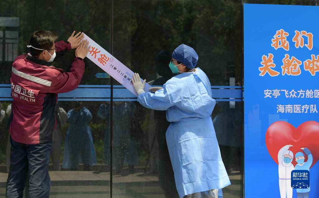 5月4日,海南省醫(yī)療隊領隊李文秀(左)和嘉定區(qū)衛(wèi)健委工作人員一起為安亭飛眾方艙醫(yī)院大門粘貼關艙封條。新華社記者 李賀 攝