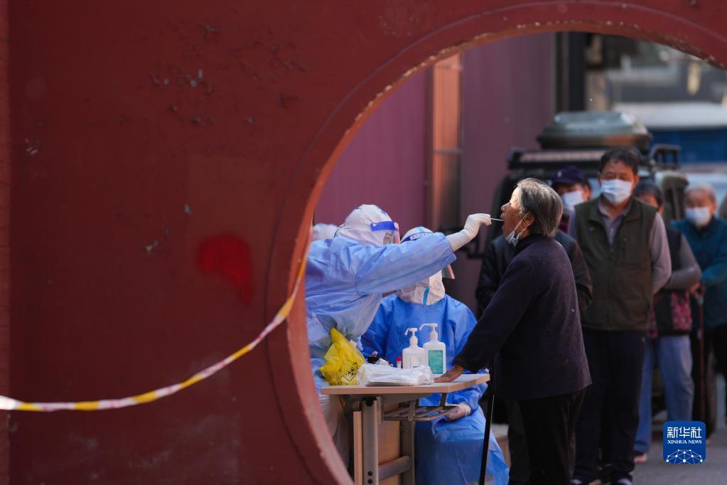 5月2日,在北京市朝陽區(qū)八里莊街道紅廟北里社區(qū),醫(yī)護人員在管控區(qū)為居民進行核酸采樣。新華社記者 鞠煥宗 攝