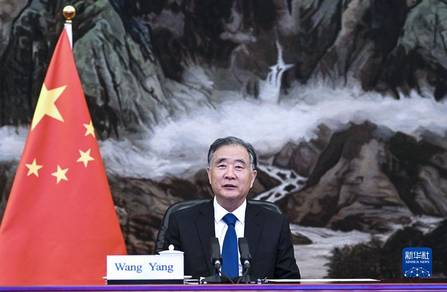 5月31日,全國政協主席汪洋在北京以視頻方式會見阿爾及利亞民族院議長古吉勒。新華社記者 饒愛民 攝
