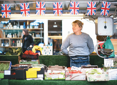 英國通脹率近來屢創新高,面對物價飛漲、生活成本增加,更多英國人會在購物時貨比三家。圖為五月三十日,在英國倫敦,一名蔬果攤主在市場等待顧客。