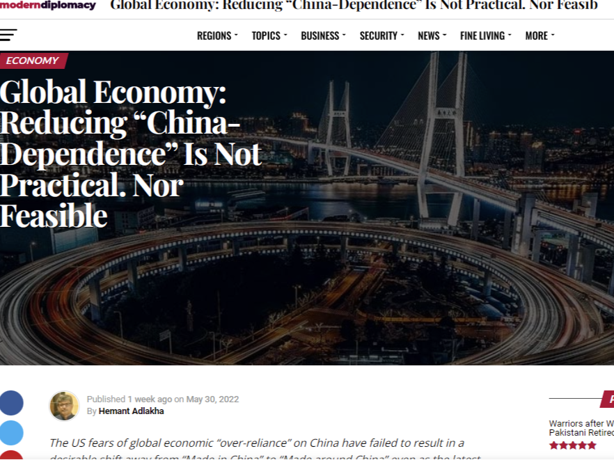 中國日報網6月7日電 歐洲《現代外交》網站近日發表題為《全球經濟:減少“中國依賴”不切實際也不可行》的文章,作者是著名印度漢學家、尼赫魯大學教授海孟德·阿德拉卡(Hemant Adlakha)。