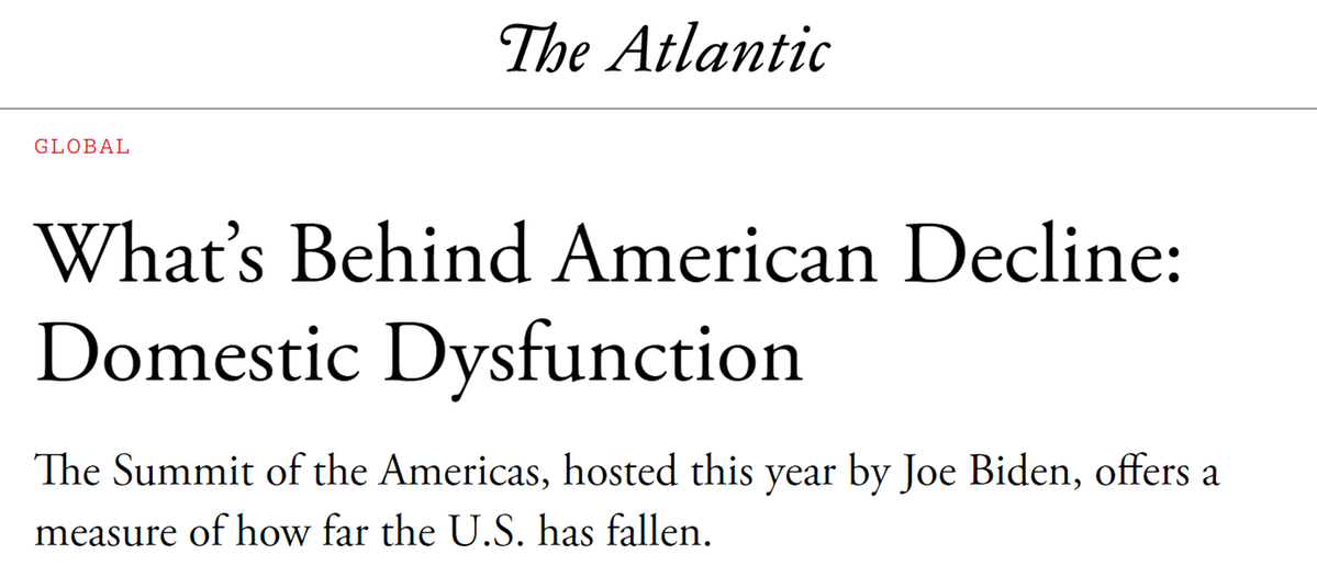 中國日報(bào)網(wǎng)6月28日電 前不久,第九屆美洲峰會(huì)在美國洛杉磯開幕。美國《大西洋月刊》(The Atlantic)網(wǎng)站刊發(fā)了一篇題為《美國衰落的背后:國內(nèi)功能失調(diào)》(What’s Behind American Decline: Domestic Dysfunction)的文章稱,透過今年的峰會(huì)不難看出美國的衰落程度為幾何。