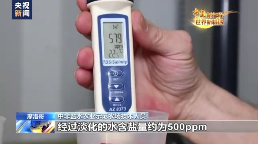 中非鹽水農業示范農場技術人員:經過淡化的水含鹽量約為500ppm,而淡化之前,地下水的原本含鹽量可以看到是稍高于4000ppm。這真是太了不起了。