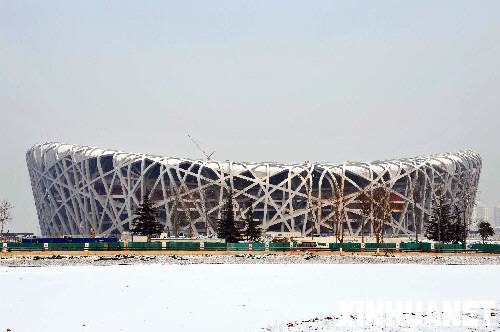 1月18日,一場降雪把國家體育場“鳥巢”的施工工地變成一片銀裝素裹的世界。 國家體育場占地25.8萬平方米,因酷似樹枝織成的巨大鳥巢形狀而得名“鳥巢”。“鳥巢”內部的9.1萬個席位包裹著一座土紅色的碗狀看臺,擁有世界最先進的安檢系統、全方位監控系統以及座位移動系統。 國家體育場是2008年第29屆奧林匹克運動會的主體育場,將舉行北京奧運會、殘奧會開閉幕式、田徑比賽及足球比賽決賽。奧運會后將成為北京市民廣泛參與體育活動及享受體育娛樂的大型專業場所,并成為具有地標性的體育建筑和奧運遺產。“鳥巢”將在2008年3月底4月初正式竣工。 新華社記者王建華攝