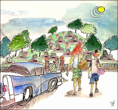 中國式的墓地設(shè)計(jì)得非常舒適,像一張超大的半圓型扶手椅。許多人會在墓前焚香燒紙。至于那些花花綠綠的鈔票,我們猜那是陰間的鈔票,專門為死者設(shè)計(jì)的。我們還看見有家人在墓旁生起了篝火,母親帶著裝得滿滿的包,里面肯定是裝滿了吃的東西——或許是烤肉吧?在墓前還放了一些蛋糕,幾瓶啤酒和白酒。