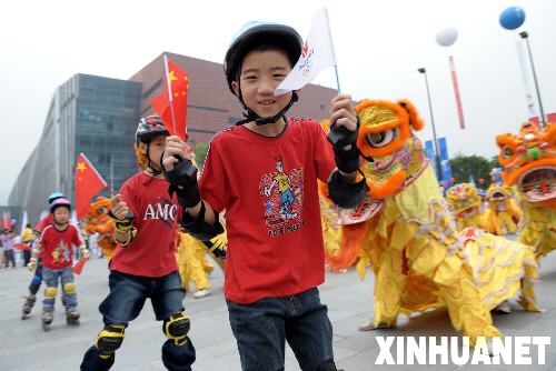 5月7日,北京奧運圣火傳遞活動在廣東省廣州市舉行。這是少年兒童在起跑儀式上進行輪滑表演。 新華社記者劉力航攝