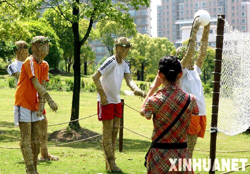 5月7日,一名游客正在拍攝“打排球”的稻草人。 近日,名為“草地上的奧運會”稻草人置景亮相上海浦東世紀(jì)公園,游客們在欣賞大好春光的同時也感受到濃厚的奧運氣息。 新華社記者 劉穎 攝