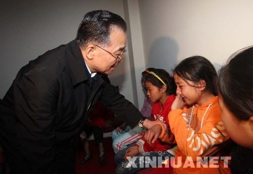 5月13日,溫家寶總理在四川綿陽九洲體育館地震災(zāi)民安置點(diǎn)看望災(zāi)民。這是溫家寶在安慰受傷兒童。 新華社記者姚大偉攝