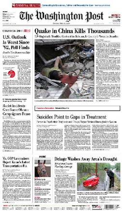 美國《華盛頓郵報(bào)》頭版:中國大地震死亡數(shù)千人