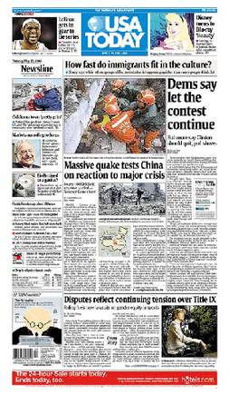 12日發(fā)生的中國汶川大地震震驚了全世界。對(duì)中國災(zāi)情的報(bào)道13日登上世界各大媒體頭版,地震造成的重大生命損失成了國際媒體關(guān)注的焦點(diǎn)。美國《今日美國報(bào)》當(dāng)日在頭版頭條報(bào)道稱,“大地震考驗(yàn)中國重大危機(jī)反應(yīng)”。