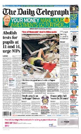 英國《每日電訊報(bào)》頭版:學(xué)校坍塌,學(xué)生被困