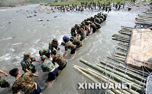 5月18日,空降兵某部官兵在傳送石袋扎橋墩。 空降兵某部官兵自5月13日進入地震重災區平武縣南壩鎮后,全力搶險救災。由于南壩鎮和外界被一條湍急的河流阻斷,這支空降兵抗震救災部隊克服重重困難,在急流上用竹排緊急架設一座“生命橋”。 新華社記者 楊磊 攝