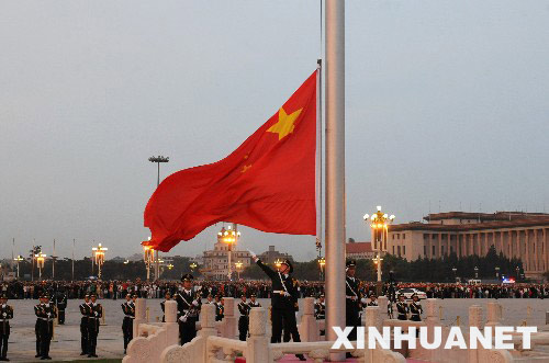 5月19日4時58分,北京天安門廣場在正常的升旗儀式后下半旗,以表達全國各族人民對四川汶川大地震遇難同胞的深切哀悼。這是武警戰士升起國旗。 新華社記者 唐召明 攝