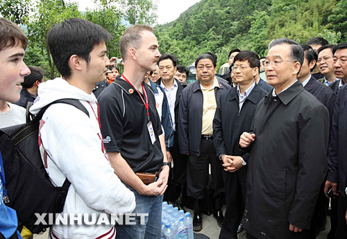 5月14日,國務院總理溫家寶抵達地震重災區四川北川縣察看災情。這是溫家寶在北川縣曲山鎮對幾位美國志愿者說,謝謝你們,我代表中國政府感謝美國人民對這場特大自然災害的受災地區所提供的幫助。 新華社記者姚大偉攝
