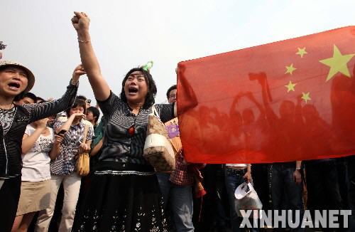 5月19日,北京天安門廣場的群眾在默哀后齊聲高呼“中國加油!”“汶川加油!”。 2008年5月19日至21日為全國哀悼日。5月19日14時28分起,全國人民默哀3分鐘,汽車、火車、輪船鳴笛,防空警報鳴響。 新華社記者薛東梅攝