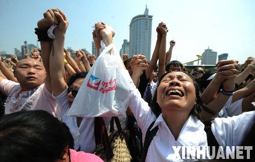 5月19日,數萬群眾匯集在成都天府廣場,深切哀悼四川汶川大地震遇難同胞!⌒氯A社記者 江宏景攝