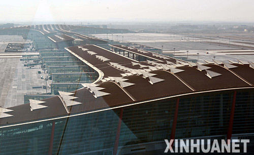 這是從塔臺上俯瞰首都機場三號航站樓(1月29日攝)。(新華社記者王建華攝)